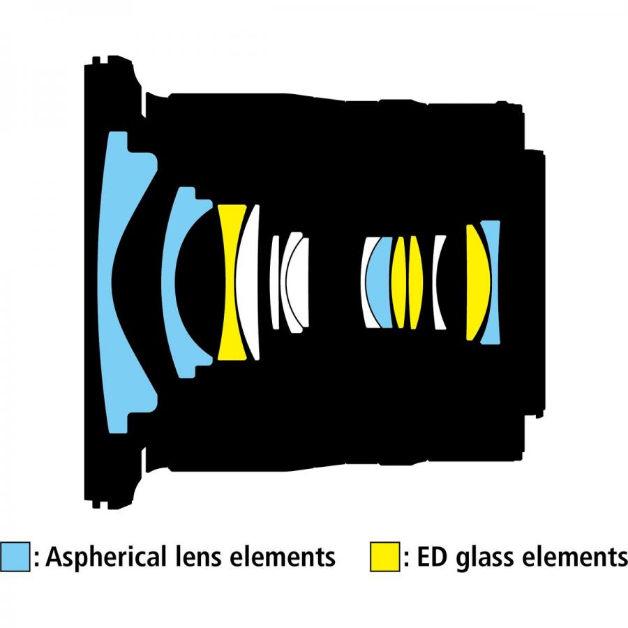 14 lentilles en 12 groupes (dont 4 lentilles en verre ED, 4 lentilles asphériques, des lentilles avec traitement nanocristal et une lentille avant traitée au fluor)